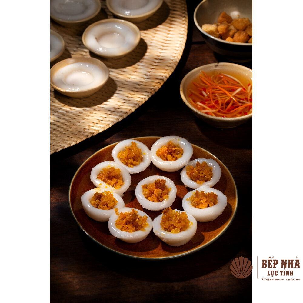 Banh Beo is a humble yet refined dish. Each small rice cake is steamed until tender, then sprinkled with stir-fried minced pork and jicama. When served, it is drizzled with fish sauce, scallion oil, and crispy fried shallots, creating a rustic yet delicate flavor experience.