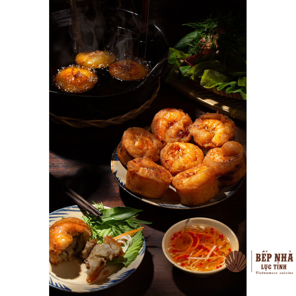 Banh Cong is a rustic specialty from Southern Vietnam. Each cake is fried in a small mold until golden and crispy, with a savory filling of mung beans and prawns. Served with fresh herbs and a sweet–sour fish sauce, it offers a crunchy, hearty, and unforgettable taste.