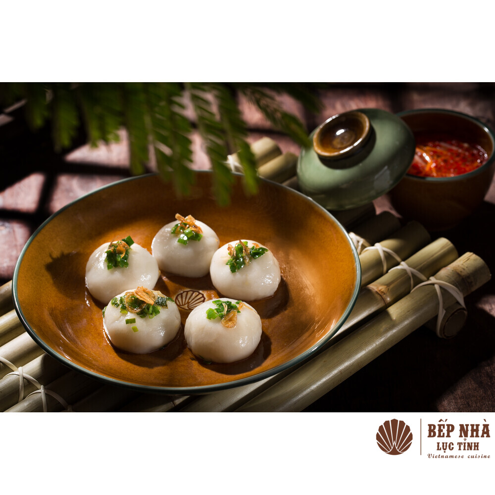 Banh It Tran is a traditional Vietnamese rustic cake. Made from glutinous rice flour, each chewy cake is filled with a savory mixture of minced prawns, pork, and mung beans. Finished with scallion oil, crispy shallots, and a drizzle of sweet–sour fish sauce, it delivers a rich yet homely taste.