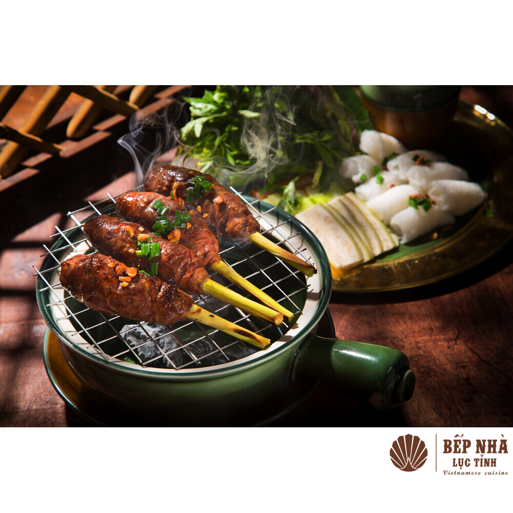 Beef is marinated with traditional spices, skewered on fresh lemongrass, and grilled until golden. To enjoy, wrap the grilled beef with rice paper and wild vegetables, and dip in sweet and sour fish sauce for a harmonious and rich flavor.