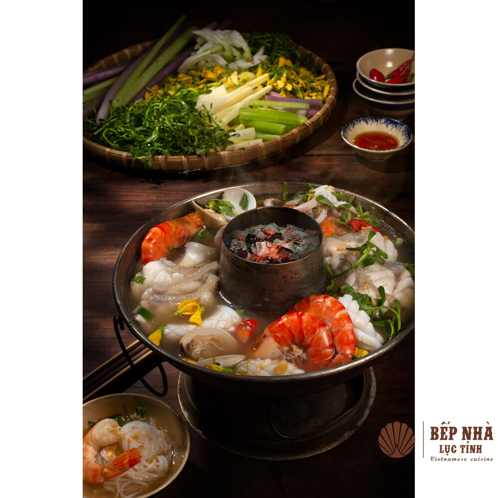 Lau Thuy Lieu is a signature Vietnamese sweet and sour hot pot. Fresh prawns, fish, squid, and river greens are added to the tangy broth, creating a perfect balance of sweet and sour flavors for a wholesome meal.