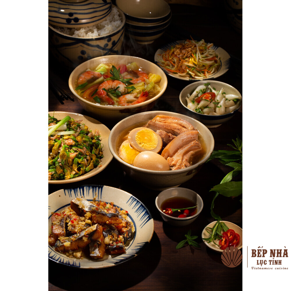 A heartfelt countryside meal with braised pork and eggs, stir-fried field shrimps with riverhemp, crispy dried Queenfish, and Eleocharis soup with prawns.