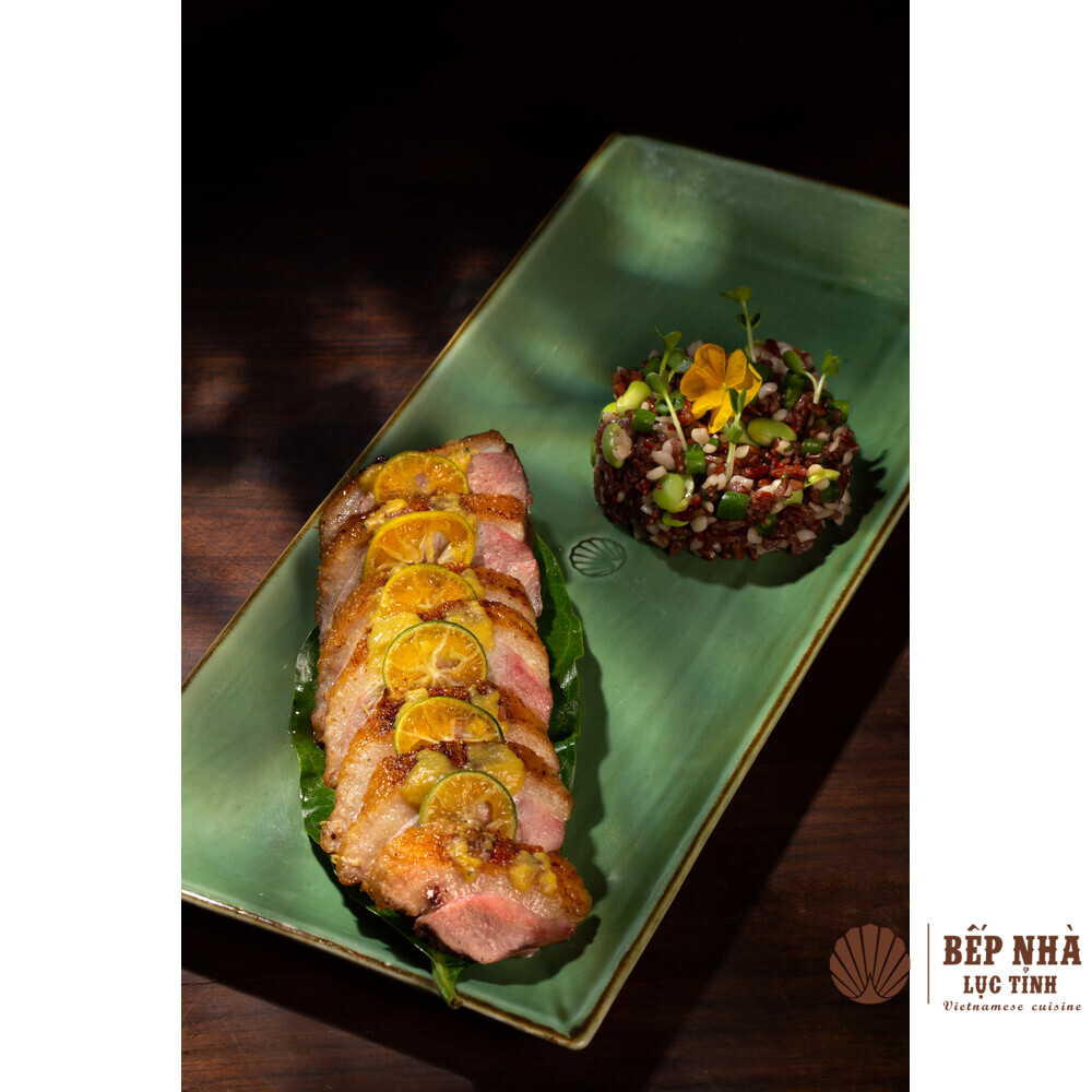 The duck breast is roasted to perfection, keeping the meat tender and juicy inside. Each bite combines the mild richness of the duck with the distinct sweet and tangy salted kumquat sauce, creating a refined balance of flavor and texture. An ideal choice for those who love Vietnamese-style grilled dishes that are both unique and captivating.
